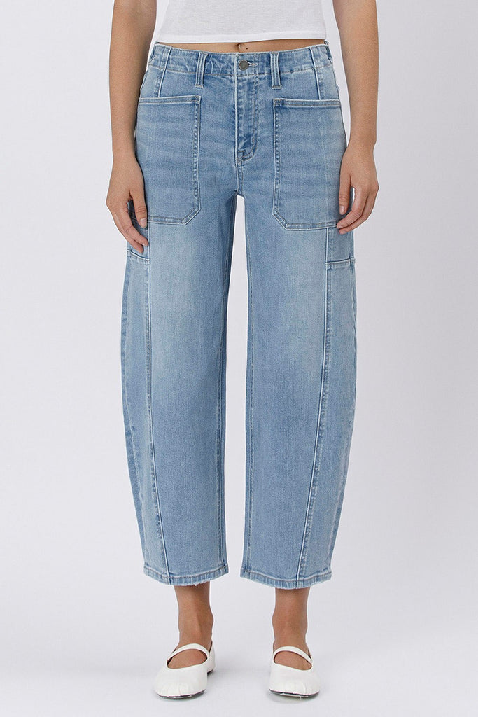 Comfort Stretch Denim, Super High Rise Waist, Elastic Band, Finished Hem, Cropped Length, Barrel Jeans