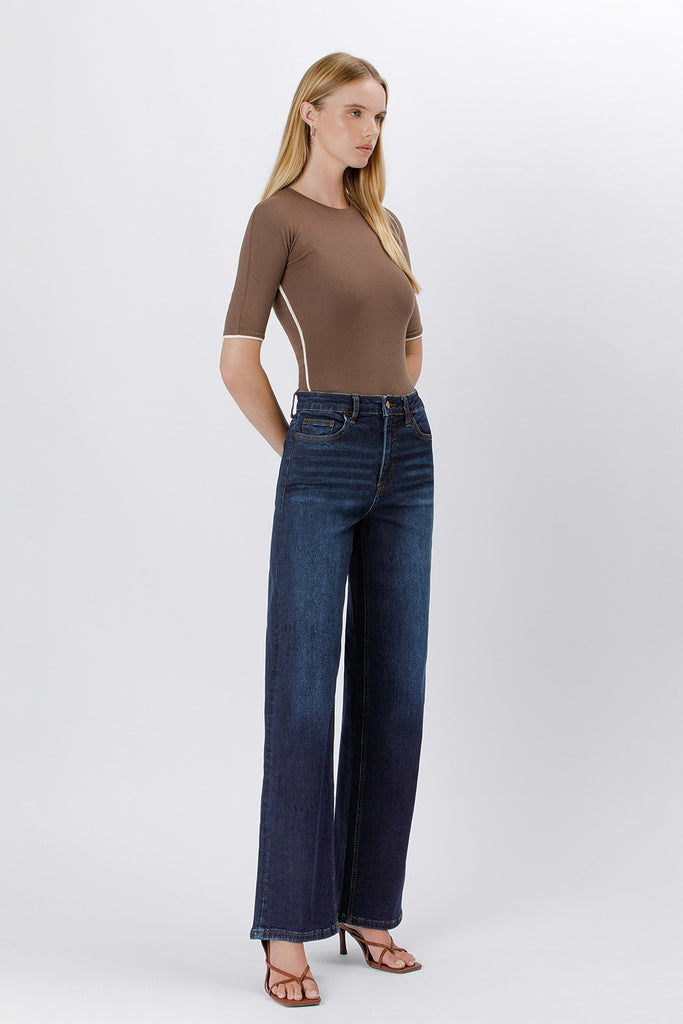 Comfort stretch denim, super high rise waist, 90's vintage style, 5 pockets, finished hem, full length, dark wash, loose jeans