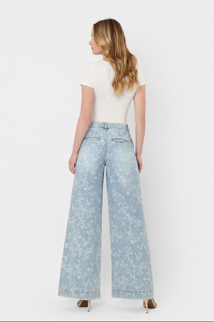 Super high rise floral print pleated wide leg jeans comfort stretch denim, super high rise waist, side slit pockets, seamless waistband, trouser hem, full length, light wash with floral print, pleated wide leg jeans