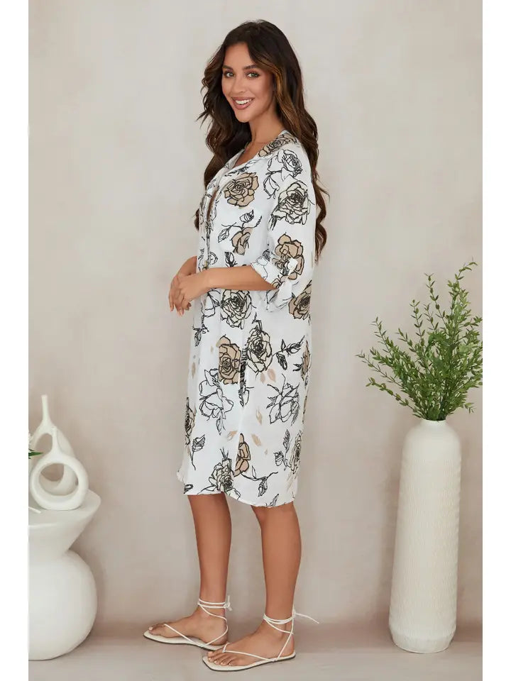 Step into timeless elegance with the rose print button down linen dress with pocket. Made from breathable linen, this dress offers comfort and style in one. The button-down front allows for versatile wear, while the charming rose print adds a delicate, feminine touch. Practical pockets provide convenience without sacrificing design. Perfect for warm days, this dress pairs effortlessly with sandals or sneakers for a chic, relaxed look.