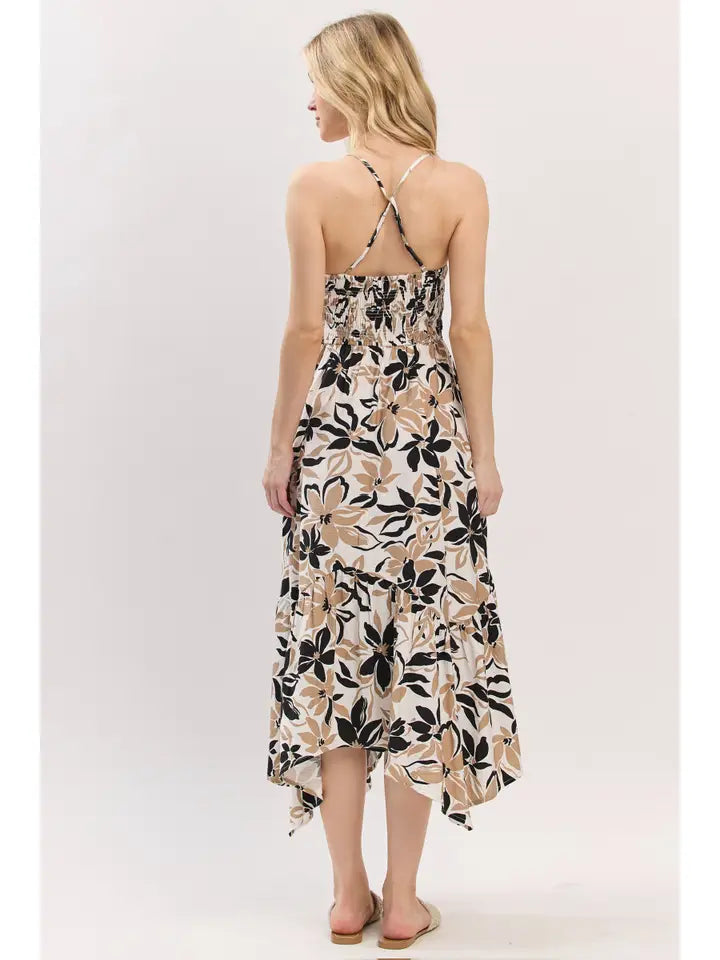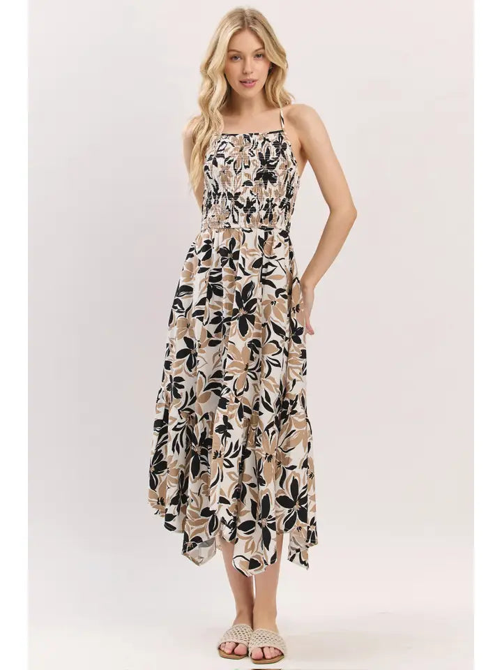 Asymmetrical Hem Smocked Bodice Midi Dress