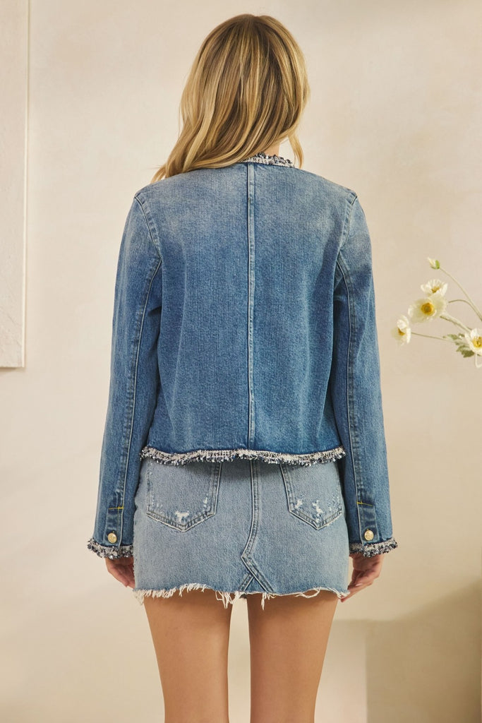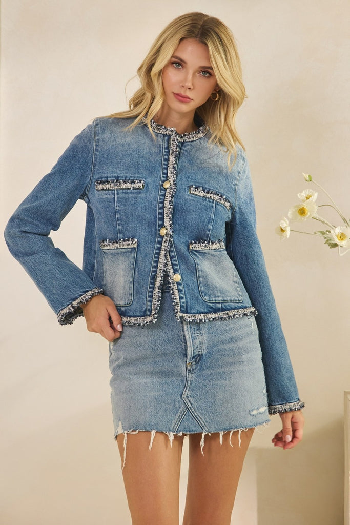 Tweed Trimmed Front Pocket Denim Jacket