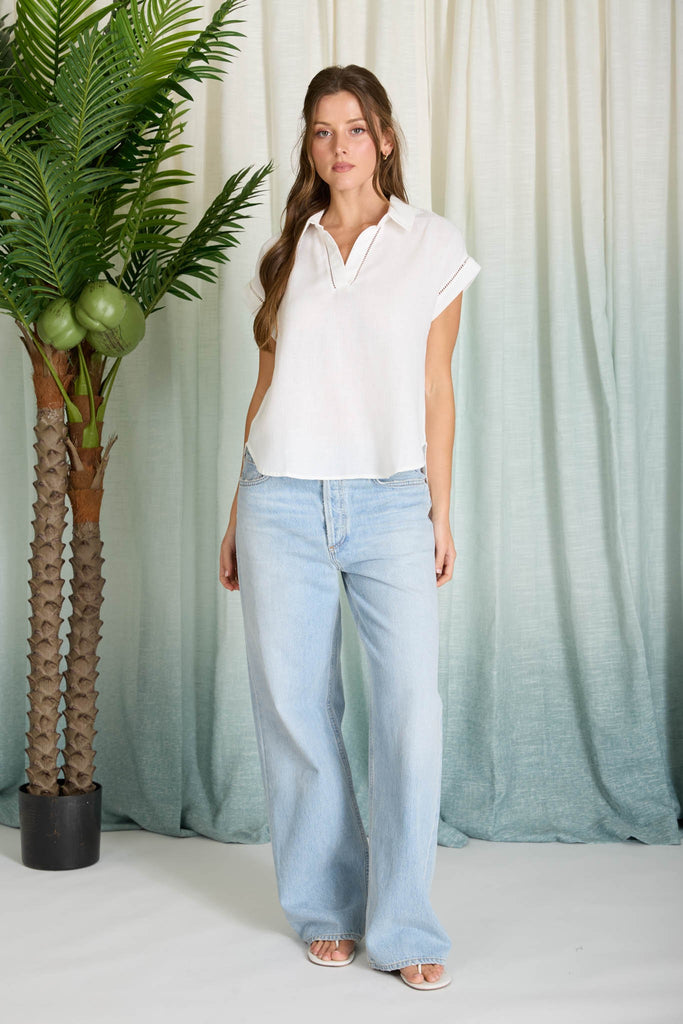 Collared V Neck Short Sleeve Line Lace Detail Top