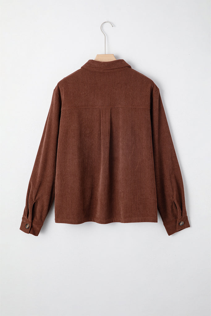 Coffee Floral Embroidered Collar Button Front Corduroy Jacket With Pocket