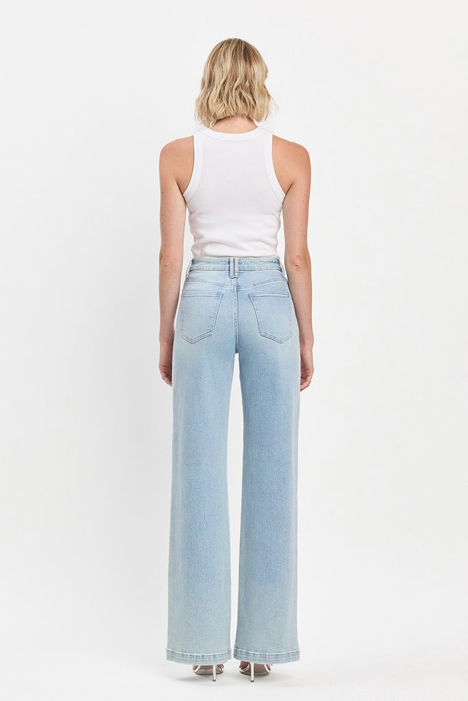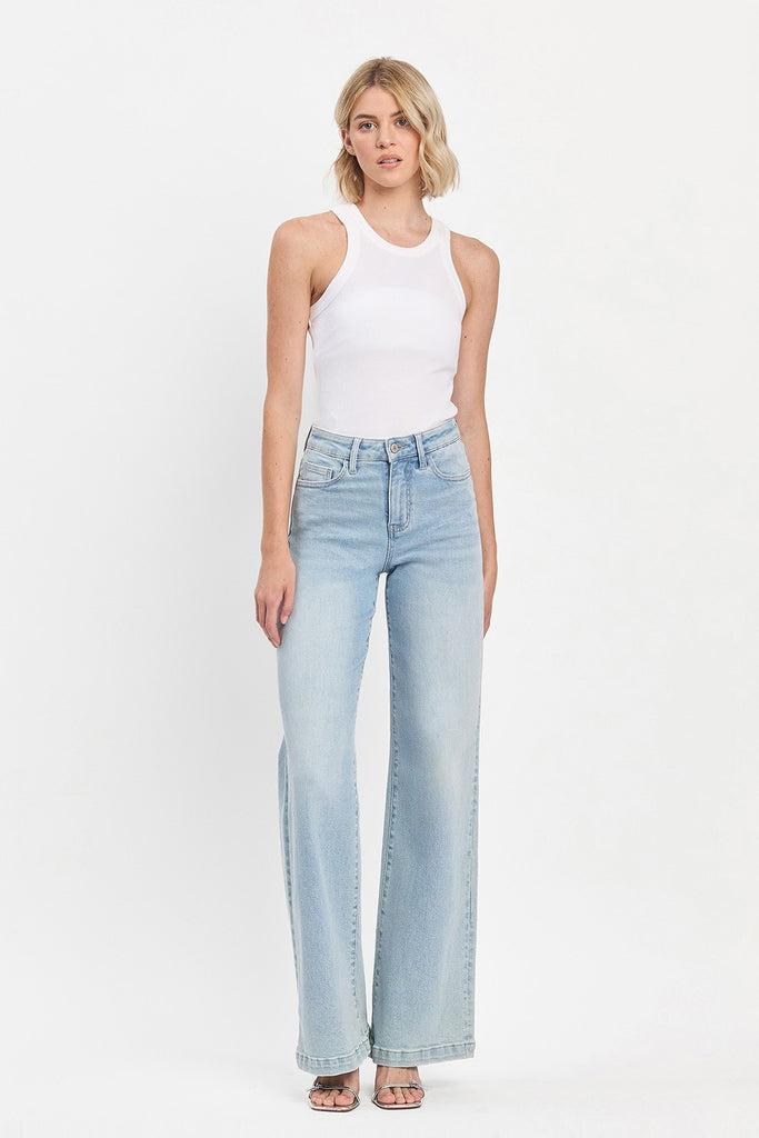 Comfort stretch denim, high rise waist, c5 pockets, finished hem, full length light wash, wide leg jeans