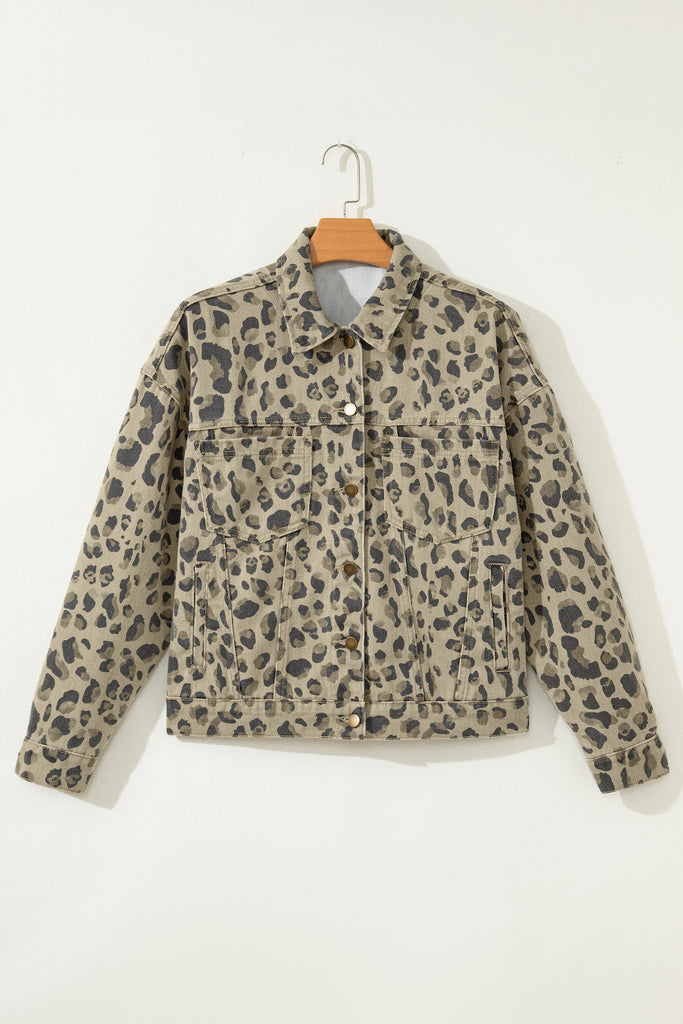 Khaki Retro Leopard Print Seam Detail Button Down Denim Jacket