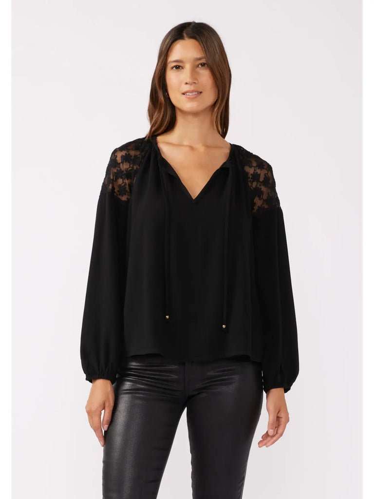 Tie Neck Blouse Long sleeve blouse with a beautiful floral embroidered mesh along the shoulder, split v-neckline, narrow tie neck, and elastic cuff. The perfect casual Fall top to pair with denim.