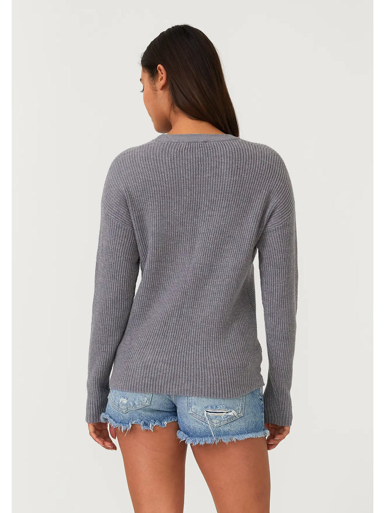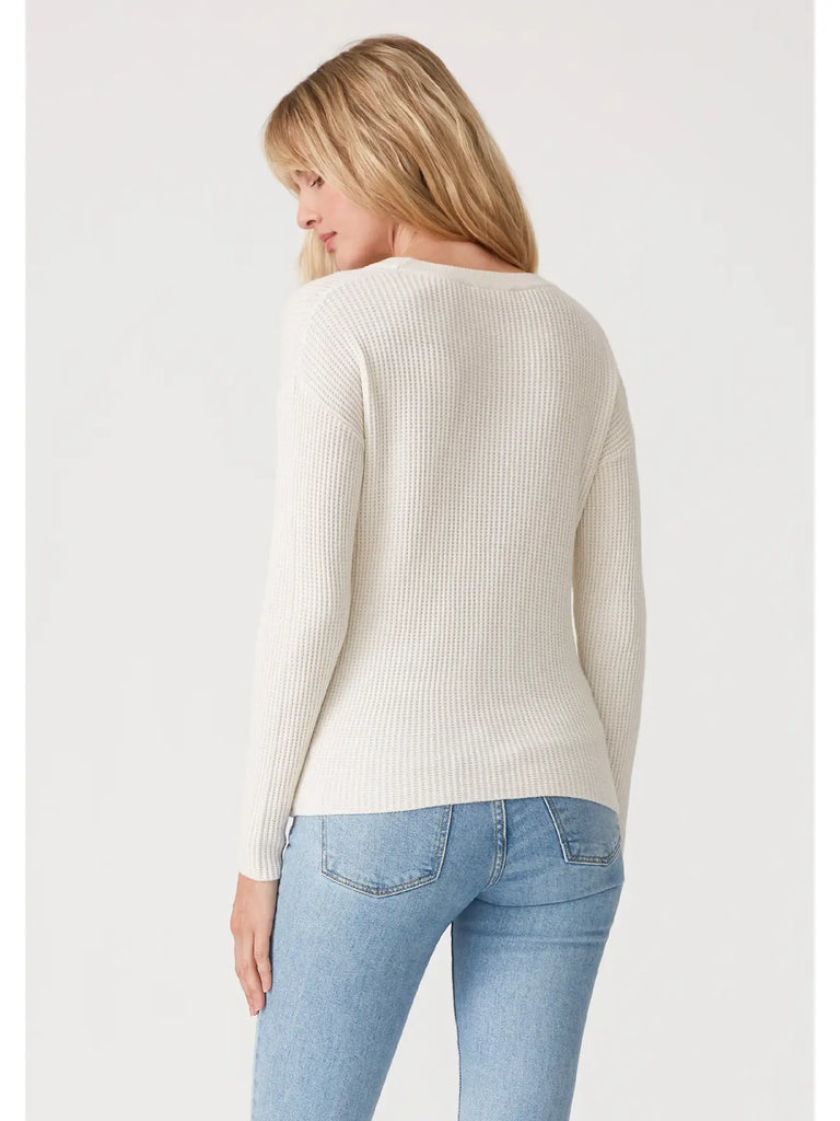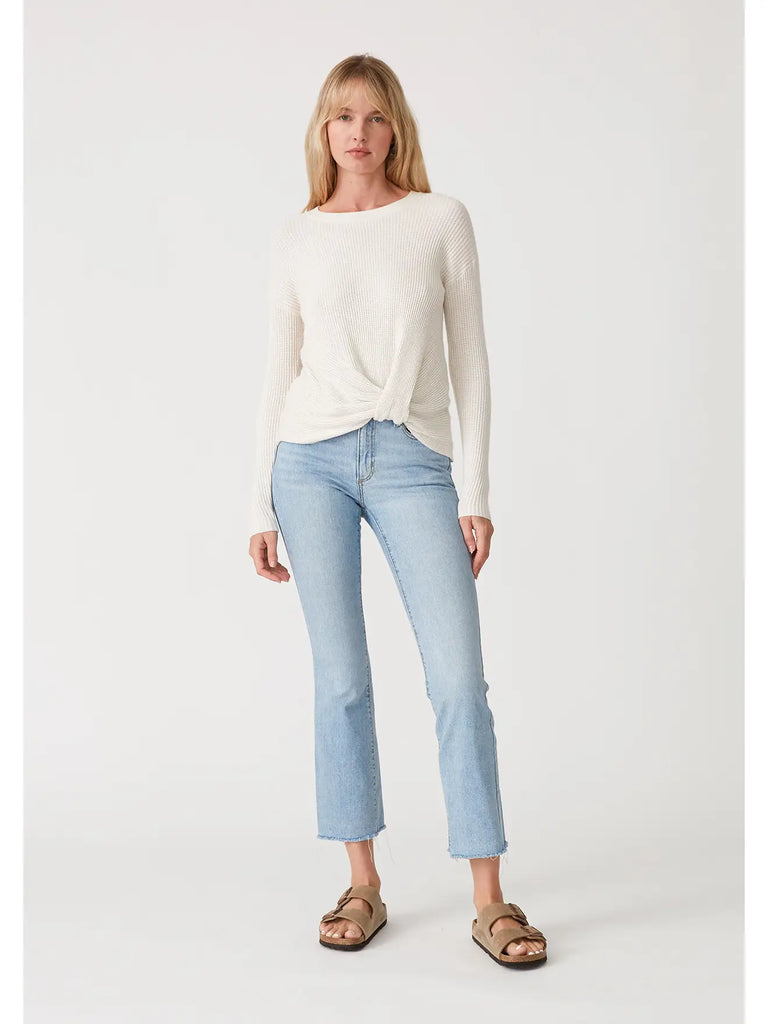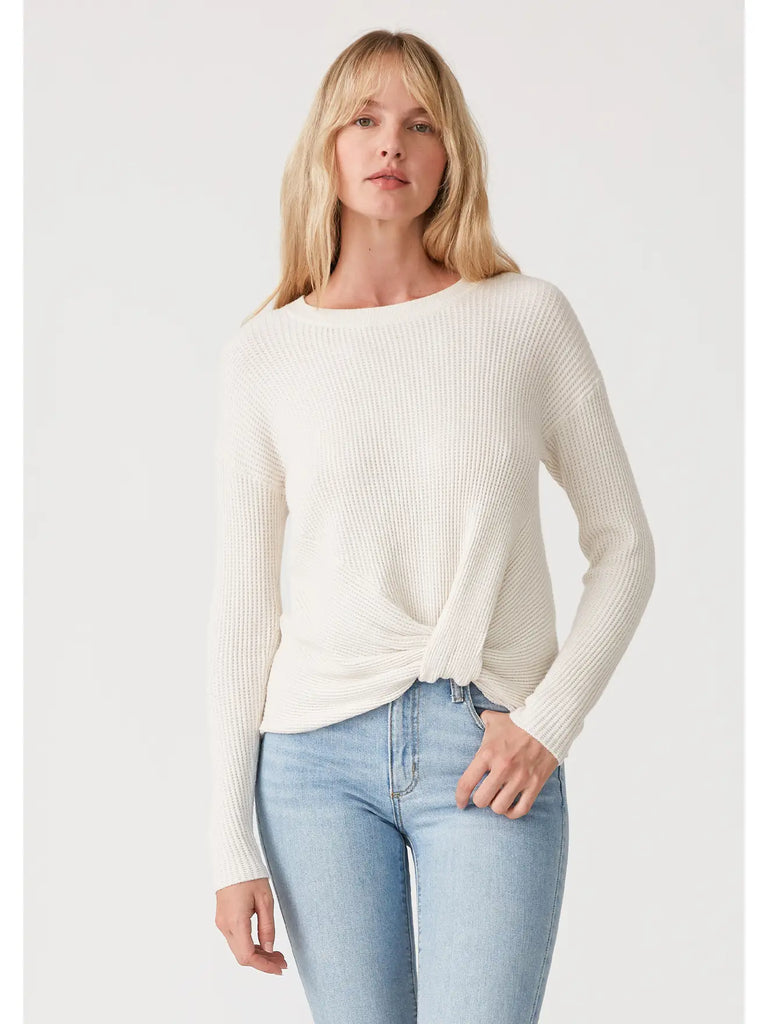 Waffle knit pullover sweater with a crew neckline, long sleeves, dropped shoulder, and front knot detail. The perfect casual knit sweater for the Fall season.